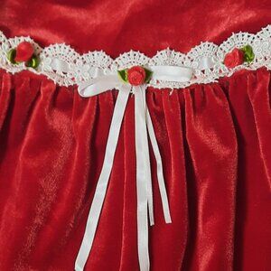 A perfect baby girl vintage Y2K Christmas velvet romper, in that classic rich red with adorable little rosettes on a white lace waistband. Delicate white trim on neckline completes the look, this holiday baby jumper is perfectly nostalgic! Put your little one in the same outfit you wore as a child.