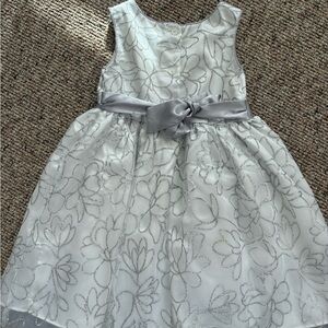 Charming white dress with floral design. Features a silver waistband with embellishments. Perfect for formal occasions.