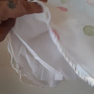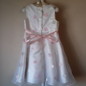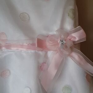 This is a beautiful, white dress with pastel pink, green and white polka dots, and a pink sparkle bow. It has a tulle ruffle bottom. In good pre owned condition. Worn once. No stains or flaws that I can see. Has button up back, and pink bow. Size 3T. Perfect for Easter, or an Spring event or adds special occasion!