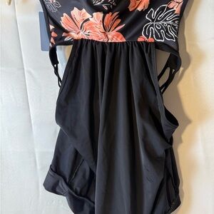 Stylish black swimsuit with vibrant orange floral accents. Racerback design. Perfect for summer.