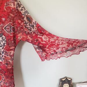 Younique Women's M Scallop Red Flower Detail Light Print Shirt Tunic Bell SLV