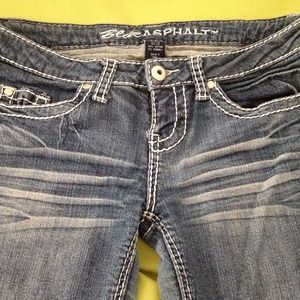 White stitched low rise denim. Cute with boots or sneakers. Washed creases under pockets.
