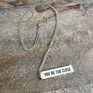 You're Too Close Silver Bar Inscribed Long Necklace on Silver Tone Chain