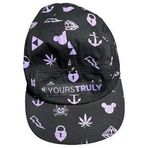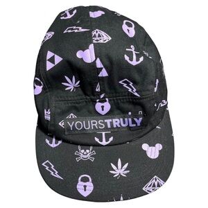 Black hat with light purple designs- skulls, heart locks, “flower” leaves, diamonds, anchors, lighting bolts, triangles, and Mickey Mouse ears.
