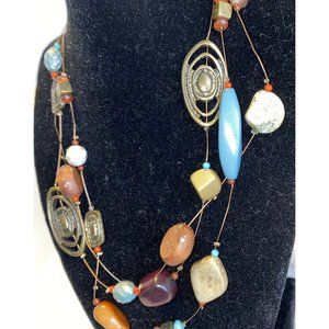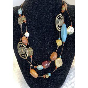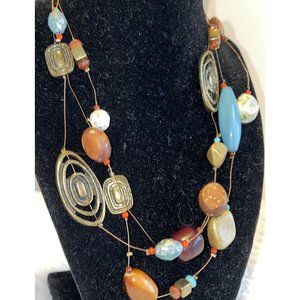 Yousi you & I Layered Necklace Earring Set Brass Tone Metal Wood Glass Acrylic Beads.