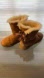 Stylish UGG boots for kids. Tan suede with cream fur lining. Features decorative brown ribbon bows on back/heel side of each boot.
