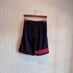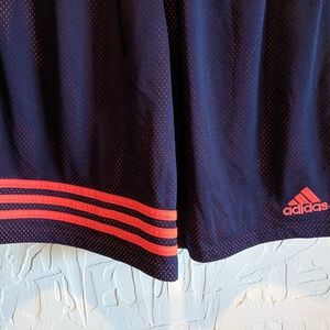 Navy mesh athletic shorts with orange signature stripes and adidas logo. Very cool mesh design where the orange peeks through slightly. Elastic waist with drawstring for extra comfort and two pockets on both sides. Excellent condition and ready for a new home!
