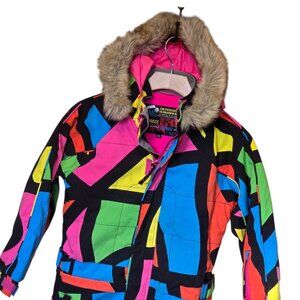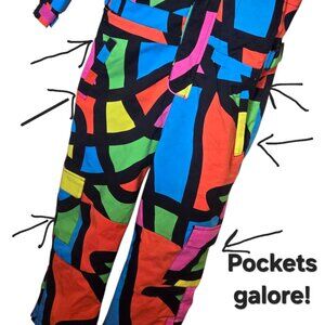 Brghten up the slopes with this colour block, unisex snowboard coverall by BLMG AIR DANCE. Perfect for snowboarding, skiing or just playing in the snow! Featuring a combination of waterproof and breathable fabric to keep you warm, dry and stylish all winter! This suit will definitely get attention! Multiple pockets, velcro & zip closure. Very good preowned condition. No rips or holes. There are a few marks as seen in the last photos.