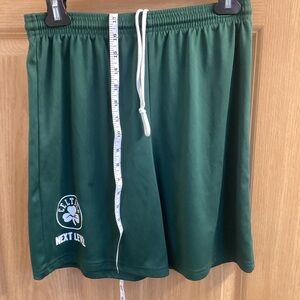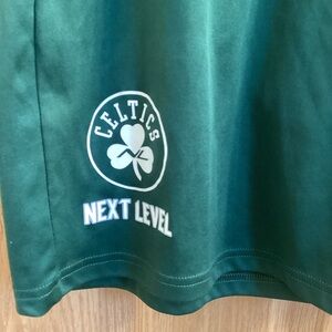 These green athletic shorts are crafted for comfort and performance. Made from a lightweight, breathable fabric, they feature an elastic waistband with a drawstring for a customizable fit. Perfect for sports or casual wear, these shorts offer a vibrant look and ease of movement. Boston Celtics