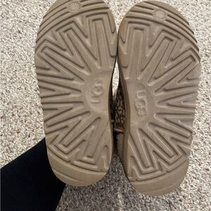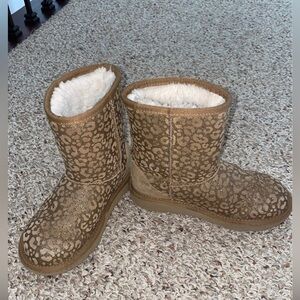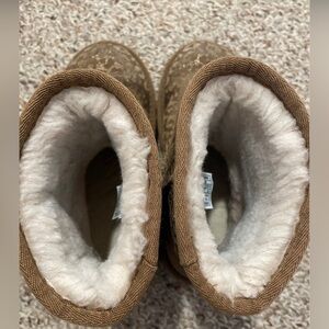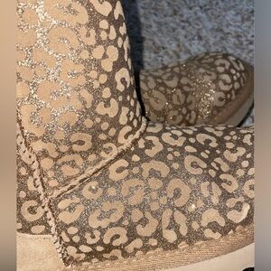 The cutest tan sparkly cheetah print Ugg’s, girls size 1. UGG written on the heel in gold. Some signs of wear, as shown in the pictures. Smoke free home. Barely worn & in the same condition as the photos show. Photos taken with & without flash. They are SO CUTE!