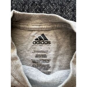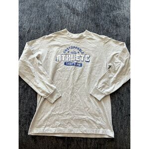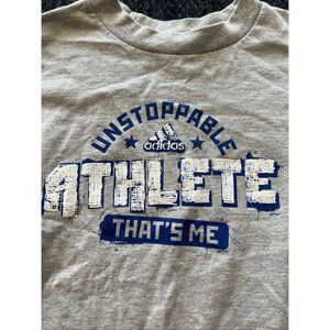 This is a grey Adidas long sleeve shirt featuring a bold 'Unstoppable Athlete' graphic on the front. Made from a soft cotton blend, it offers comfort and style for casual wear.
