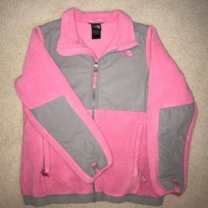 Incredibly soft and comfy The North Face Denali fleece jacket. The jacket is used but has no flaws or signs of wear. The fleece is not as soft on the outside as it used to be but it is still very soft on the inside. The color is a pretty pink with light gray accenting. The jacket is a youth L (15/16) but could easily fit a S/XS Woman.