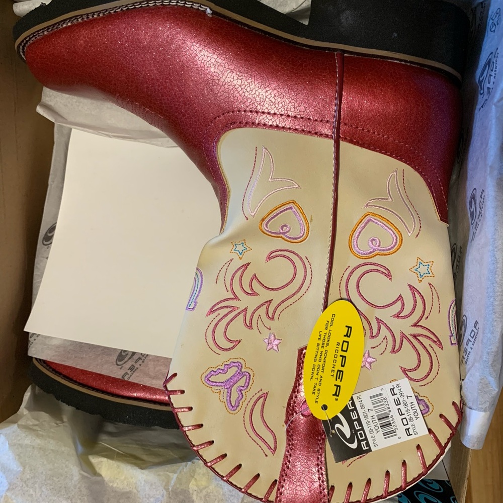 Brand new set of Pink Roper Boots. YOUTH size 7. Pink is a pretty fuchsia color with added shimmer. Embroidered hearts on top’ never worn.