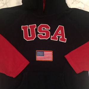 This is a great preowned youth Large blue and red USA sweatshirt with a hood.