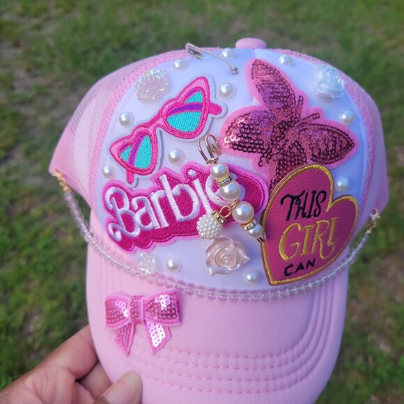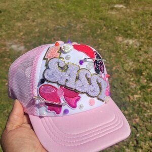 One barbie style trucker hat. The second one with sassy on it. Both pink with patches and embellishments on it.