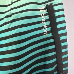 Youth size, Hurley, phantom swim trunks in greenish blue and black stripes there is some cracking in the metallic silver Hurley logo emblem