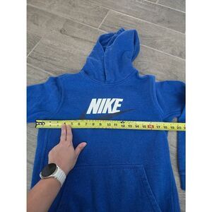 Unisex youth Nike club fleece hoodie sweatshirt. Smooth, soft outside, with a soft brushed fleece inside. Kangaroo pocket. Lightweight, but cozy and warm. Color is game royal/white. Very good condition. Size XL, approximate measurements in photos