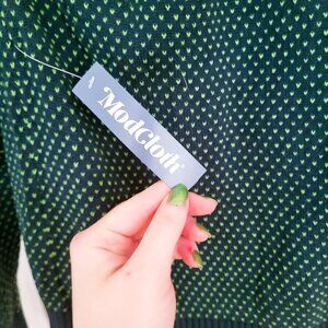 Super cute mid-weight sweater from Modcloth. Brand new with tags, has only ever been tried on. Dark green with lighter green dots and vibrant details.