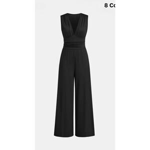 The Yozy Charcoal Gray Wide Leg High Waist Stretch Ruched Sleeveless Jumpsuit in size L is a stylish and versatile one-piece outfit perfect for multiple occasions. Made from a blend of polyester and spandex, this jumpsuit features a V-neckline, pullover closure, and wide-leg design for a flattering fit. The ruched accents add a touch of elegance to the solid dark gray color, making it a chic choice for travel, parties, work, or business events. With its machine washable care instructions and comfortable stretch material, this jumpsuit is a must-have for any fashion-forward woman.