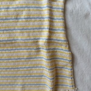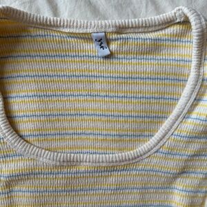 Ysé Paris t-shirt in size 34/0/XS. Yellow and blue stripes, scoop neck, sweet ruffles on hemline and sleeves, organic cotton.