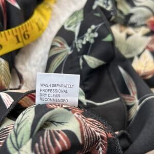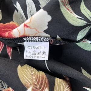 Black and floral print dress with ruffled edges, short sleeves, and an adjustable wrap style. No pockets.