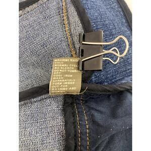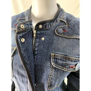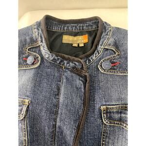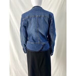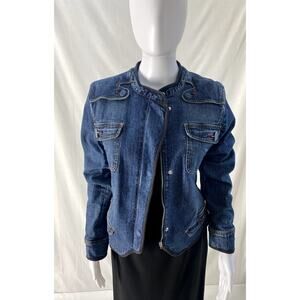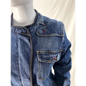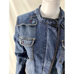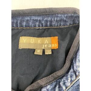 Yuka Jeans denim jacket no collar in denim blue with dark piping. 98% cotton 2% spandex. Two front flap pockets, hidden zipper closure. Button Details. Preowned and worn but in excellent shape.