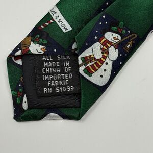 Men's Yule Tie Greetings Hallmark vintage necktie. 62" long x 4" wide. Features traditional white snowmen on a green background.