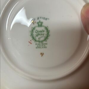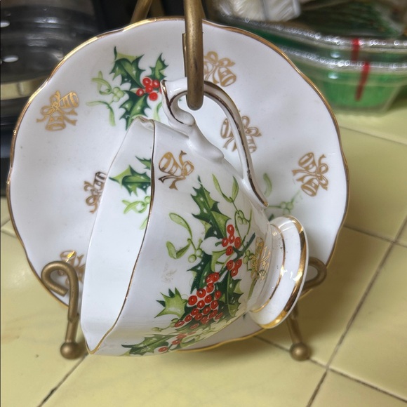 Yuletide Queen Anne Celebrate the season with this elegant teacup and saucer set, featuring festive holly and berries designs. Perfect for holiday gatherings. I am including the stand too.