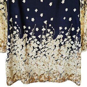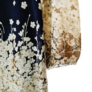 Step into elegance with this stunning Yumi dress, featuring a delicate ombre floral design that blooms upward from hem to neckline. Cream and tan flowers cascade across a rich navy backdrop, creating a graceful and eye-catching effect.