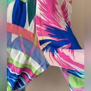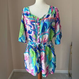 Yumi Kim 100% silk romper tropical pockets, tie sleeves and button detail. L