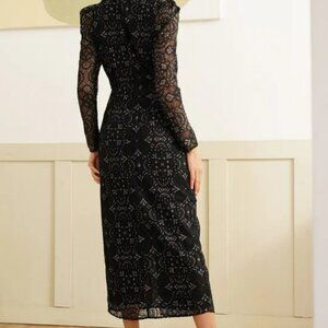 The Maybel lace dress is a stylish option for next event. This dress boasts a sophisticated high neckline, puffy shoulders, elegant long sleeves, and a figure-flattering pencil skirt.