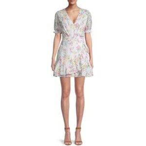 YUMI KIM Mulberry Ivory Eyelet Lace Be The One Dress with an intricate eyelet overlay ruffle hem and faux wrap mini dress. The dress is lined and the sleeves are not. Darling dress. Perfect for spring or summer semi formal events and date or girls nights out.