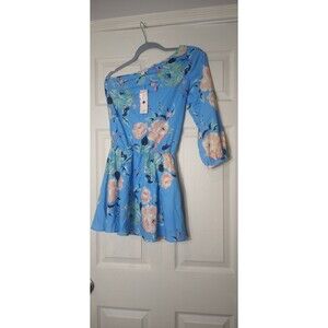The Yumi Kim Dress in size Small is a beautiful blue floral dress perfect for parties or casual occasions. With a one-shoulder design and long sleeves, this boho-inspired dress features a unique rose garden pattern and mini pockets for added style. Made from a blend of polyester and spandex, this short dress is lined and features a pullover closure for easy wear. Designed for summer, fall, and spring, this dress is a stunning choice for women looking for a classic yet trendy outfit.