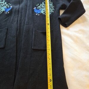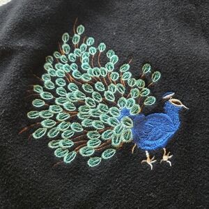black sweater with beautiful blue embroidered peacocks