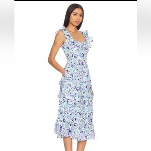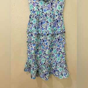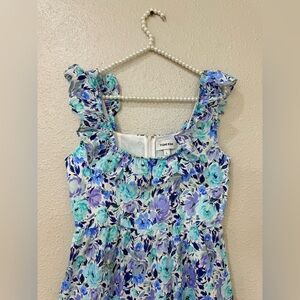 Step into elegance with this Yumi Kim sundress, showcasing a captivating floral print in blue and purple hues. Designed with a scoop neckline and flutter cap sleeves, this midi dress offers a flattering silhouette with a fitted bodice and a flared skirt. Ideal for wedding guest or cocktail occasions, its light and airy fabric ensures comfort and style.