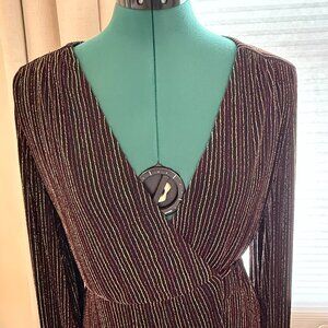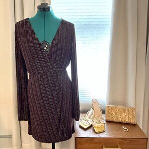 tunning Yumi Kim true wrap mini dress in a luxe velvet/velour fabric with metallic lurex striping that shimmers beautifully in the light. Deep burgundy/plum base with gold + silver accents = the perfect glam color combo!