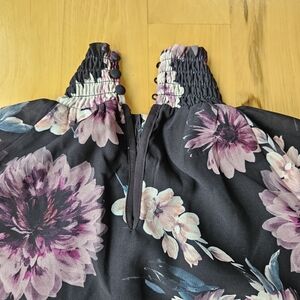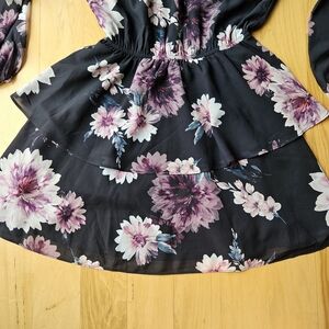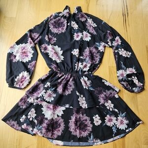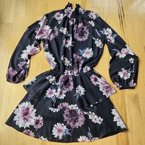 This elegant dress by Yumi Kim features a stunning floral pattern in romantic shades of pink and purple. Designed with a fit and flare silhouette, it boasts long bishop sleeves and a sophisticated mock neck, making it perfect for a wedding guest or a night out.