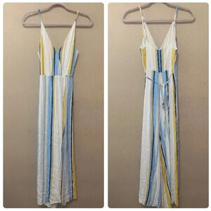 Our flowing Rush Hour Maxi Dress is your new go-to from weddings to running around the city. This striped dress includes a crossover bodice with deep v-neckline, snap chest closure, self-tie waist, and adjustable spaghetti straps.