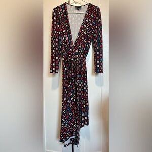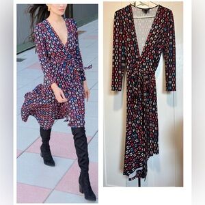 This Yumi Kim dress showcases a chic wrap design with a tie front, perfect for casual or work settings. The vibrant red and blue colors complement the long sleeves and v-neckline, creating a sophisticated sheath silhouette. Ideal for adding a touch of elegance to your everyday wardrobe.