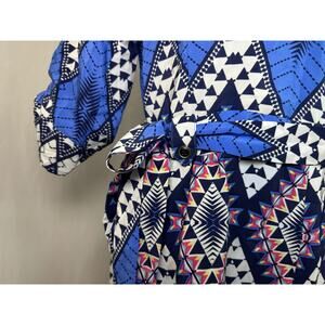 This gorgeous romper by Yumi Kim is crafted from 100% silk and features a bold geometric tribal print in striking shades of blue, white, and pops of pink. Lightweight and breathable, this romper is perfect for any occasion where style and comfort are key.