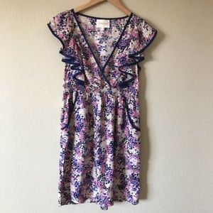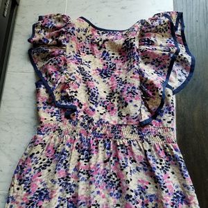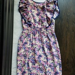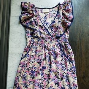 Yumi Kim 100% silk mini dress in a pink, purple, cream patter with Navy blue piping around the pockets and flutter sleeves. This dress is super light weight and reall great for hot summer days, even in the office. Worn a handful of times, good condition. Would fit a 0 or 2.