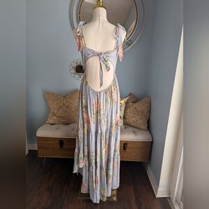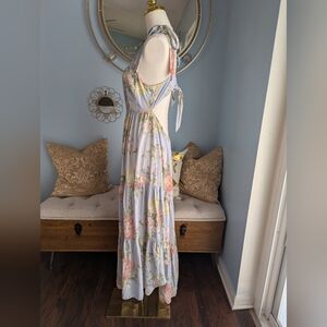 This stunning maxi sundress by Yumi Kim showcases a beautiful blend of blue and pink. The dress features adjustable bow straps which gives way to an open tie back and finished with a tiered peasant skirt. The sleeveless design offers a chic and airy style. Crafted for comfort, this dress is perfect for making a statement at any special occasion.