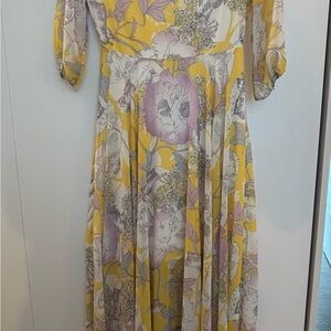 This elegant sundress by Yumi Kim features a vibrant yellow floral pattern on a white backdrop, perfect for a wedding guest or resort wear. The dress boasts a crew neck and 3/4 sleeves, with a fitted bodice that flows into a sweeping maxi skirt, offering a romantic and airy silhouette. Be carefree in Yumi Kim’s lilac and sunshine yellow masterpiece.
