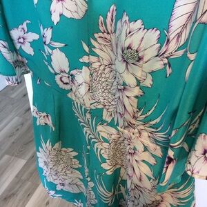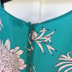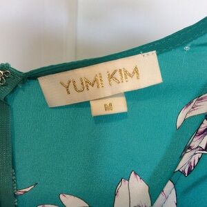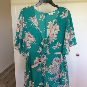 Yumi Kim silk Cast Away Romper in Tahiti Sunrise Teal. Size medium, which fits like a 4/6. Zipper in back, cute tie in front, perfect for your next vacation!