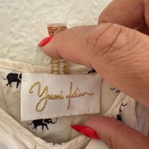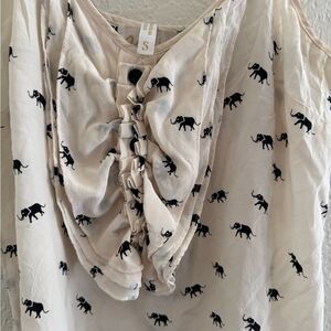 This stylish camisole by Yumi Kim showcases a cream hue with a ruched detail and ruffs/button in front look. With black elephants printed on it. offering a chic and feminine touch. The sleeveless design and lightweight fabric make it an ideal choice for both casual and elegant ensembles. In good condition no hole, rips, or stains. Perfect for summer time.