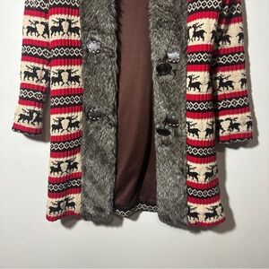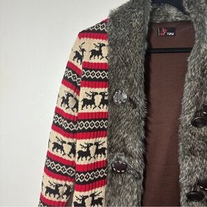 Stylish coat featuring a red and cream pattern with faux fur trim and faux leather buttons.