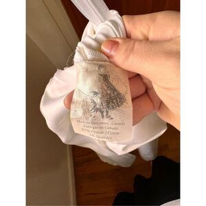 No stains or holes but a little smudging on hem where it dragged the floor in the showroom. Easily rubbed off or dry cleaned!