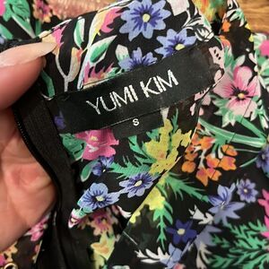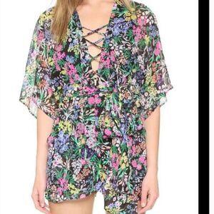 A filmy chiffon Yumi Kim romper in a flirty floral print Slim ties lace up the bodice in front