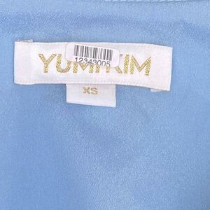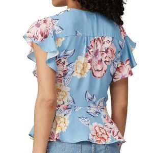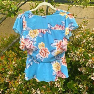 Yumi Kim Light Blue Floral Courage Blossom Top. Size XS. This refreshing Yumi Kim top is styled with ruffle sleeves in a colorful floral pattern, making it the perfect peplum top for spring and summer. Short sleeves. V-neckline. Exposed front button-down closure. 100% Polyester. Excellent Pre-Owned Condition other than two button closures that have broken - Easy Fix. Ships from a smoke and pet free home.