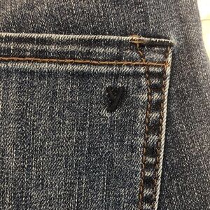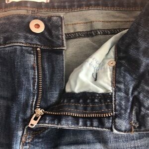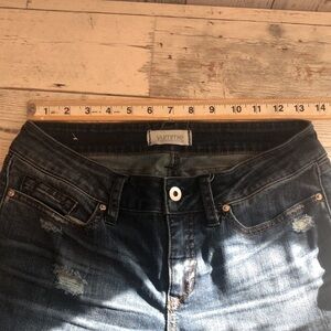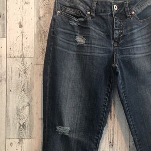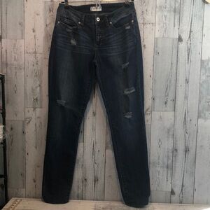 Blue denim, distressed,5 pockets, belt loops, zipper and button closure,colors may vary due to lighting,good used condition, Sz: 28